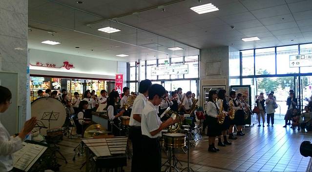 为了换乘九州横断特急,在别府站中转。碰巧在车站遇上学生们正在进行管弦乐演出,吸引着大批来往的路人驻足。曲子欢快跳跃,学生们时不时跟着旋律旋转着,舞动着,各乐器和声得相当完美,给路人们带来好心情。