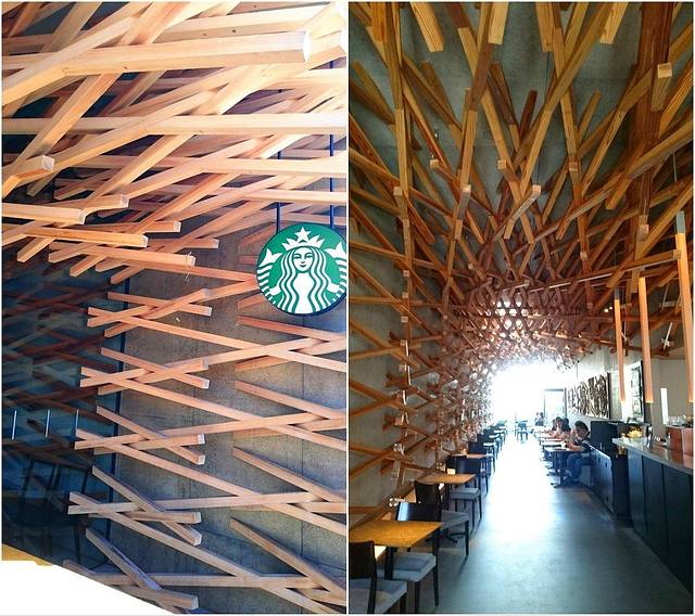 网上提到特别的星巴克,要不是看到醒目的招牌,真没想到是咖啡馆。由建筑师隈研吾(Kengo Kuma)设计,交叉的木阵构成整个店铺,使得这家店与传统的星巴克截然不同,他的理念是,如果需要,随时可以将这些木头块取下来,在别处组装,咖啡馆就可以随处移动了 ,十分环保哦。