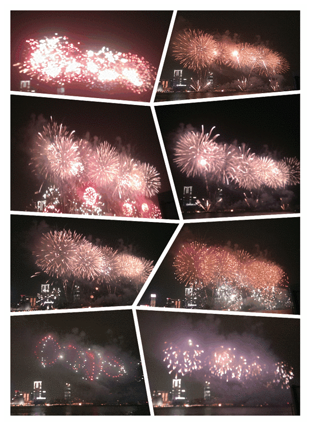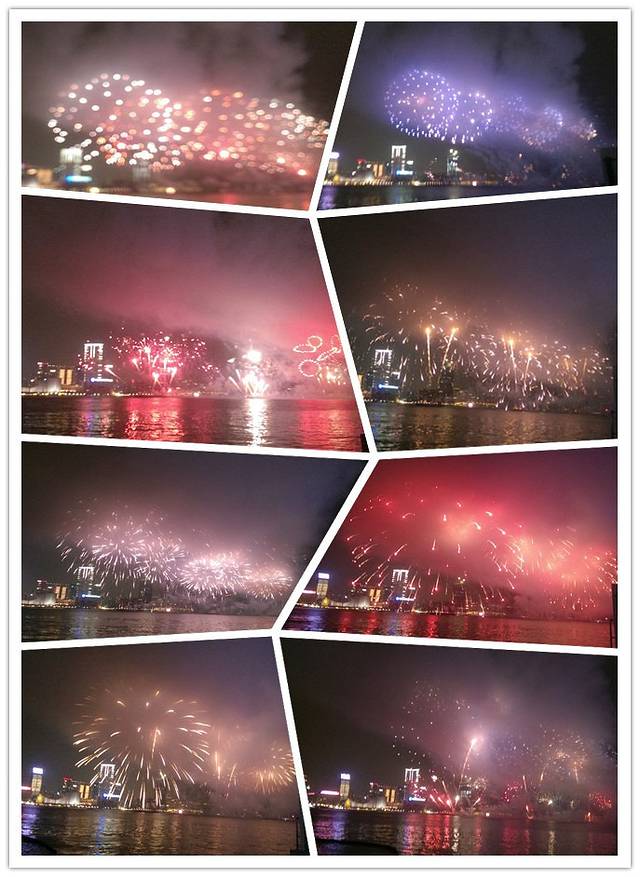 因为要汇合香港友人,一同去欣赏国庆烟花表演。我们随便去了快餐店吃晚饭就要起行,以当时吃完晚饭时间计算,香港友人说要争夺有利位置只有在金钟一带仍有机会,而尖沙咀海岸和湾仔金紫荆广场一带要中午时段就去霸头位。一般来说发放烟花的船只都是停泊在金紫荆广场对开位置,尖沙咀和湾仔的地利优势吸引了大批人前往已致形成相当挤迫的局面,所以后来我们决定去香港政府总部对开海滨长廊欣赏,果然去到目的地时人还尚少,几经努力终于找到有利位置让儿子站头排,这样就不需要抱着他可以舒服地观看烟花表演了。