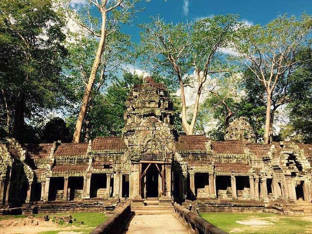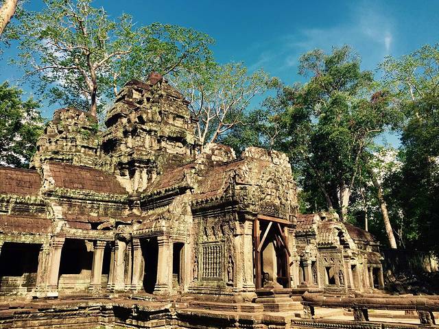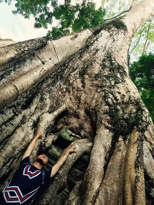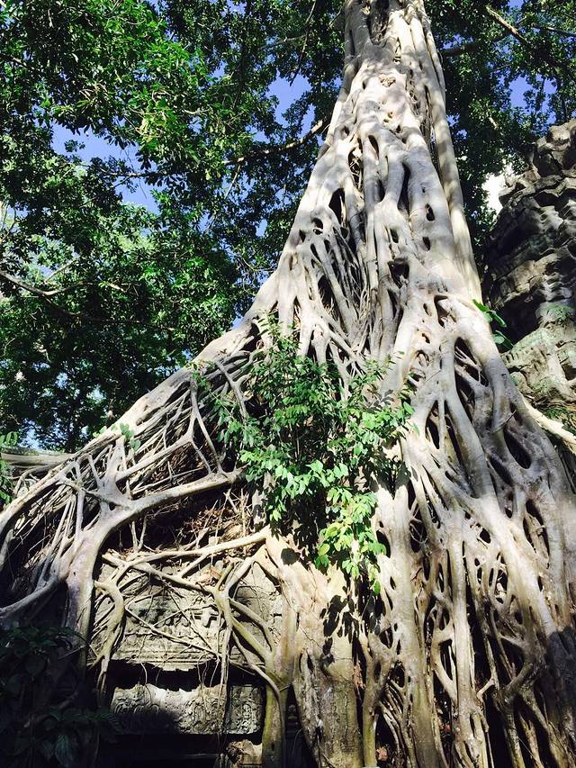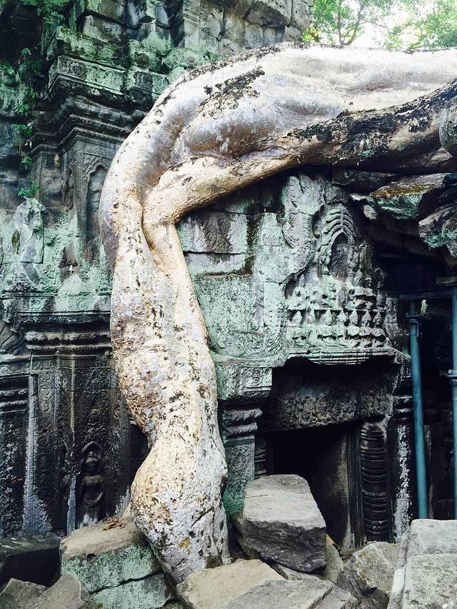 当19世纪法国人重新发现这里时最终放弃了整修而保持了最初的模样是因为整个寺庙被一种当地人称作蛇树的卡波克树(Kapok)粗大的树根茎干盘结缠绕,粗壮得发亮的树根树茎伸到屋顶,缠上梁柱,探入石缝,裹起回廊,攀上门窗,它们无所不在,几乎与庙宇浑然一体,你中有我,我中有你