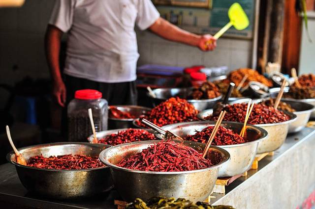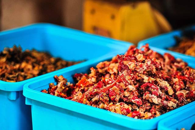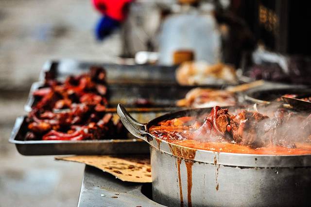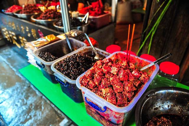青岩的美食---几乎都是这一个颜色---红色,看着很有食欲。卤猪脚味道很香,剩下的基本都是辣的---最有名的是鸡辣角---给我的感觉就是当地人利用各种食材来吃辣椒,吃什么不是重点,辣椒才是主角。不过这里如此多雨潮湿,吃辣椒也是生存需要。