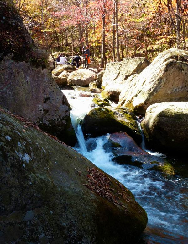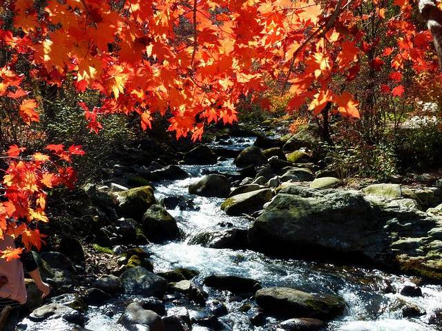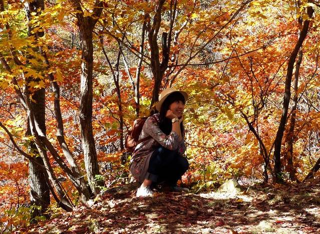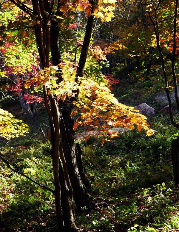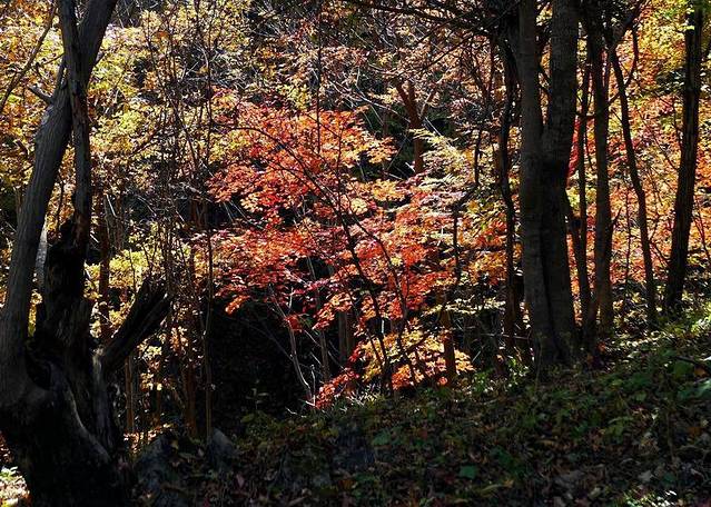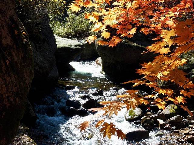 实践中明,我们的选择是正确的。秋天里的大石湖、老边沟分外神奇、秀美,那一汪影动着俊逸峰岭、枫林火舞的湖水,在蔚蓝的天空下显得五彩斑斓;那一抹绚丽如霞、热情如火的枫红,沉浸在温柔秋风的无限遐思中;这缤纷如画的山水中,枫叶飞舞、遍地飘红、泉水叮咚、宛如世外桃源、人间仙境......而最让人心怡的是游人不多,可以自由自在的踏秋、摄影。