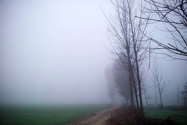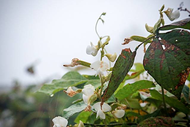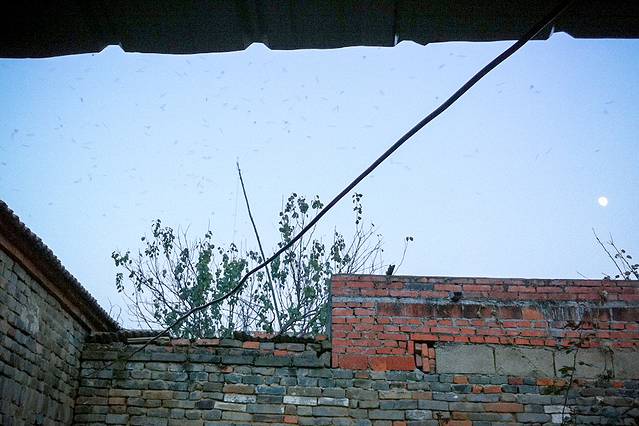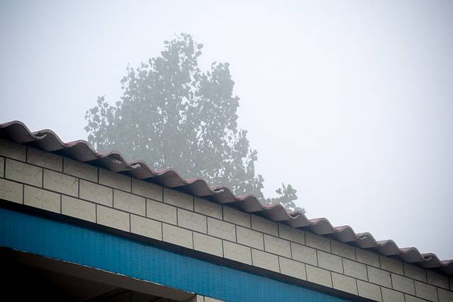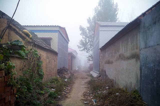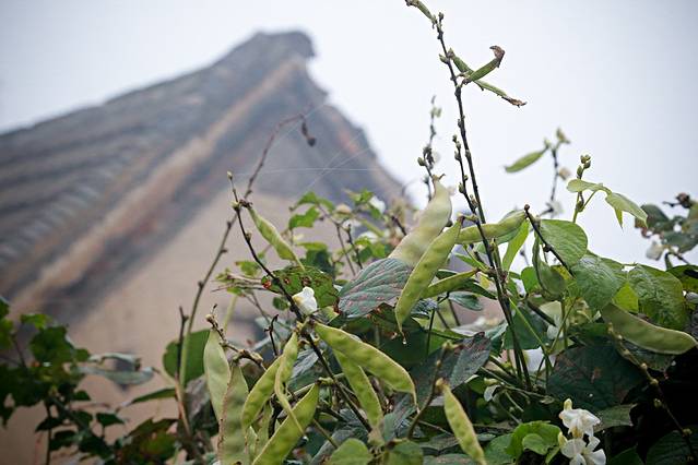 Joe一早出去拍了片回来,从照片中很难相信眼前的这景象跟来时阳光灿烂万里无云是同一片天,抬头只能看清屋檐爬的豆和蛛丝网,能见度才几十米,麦田早已经不知去向。