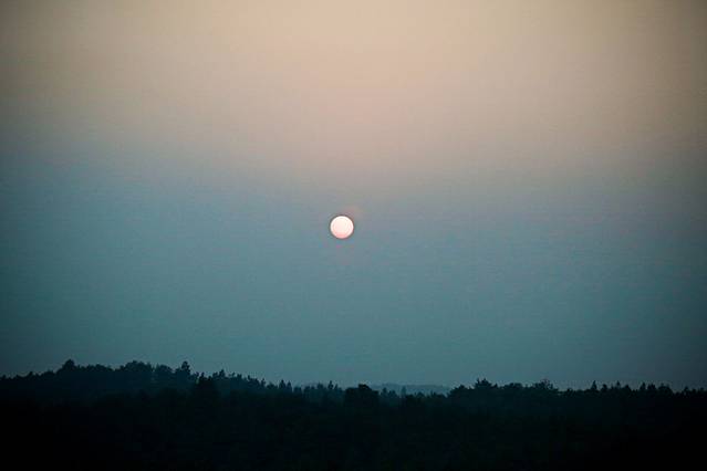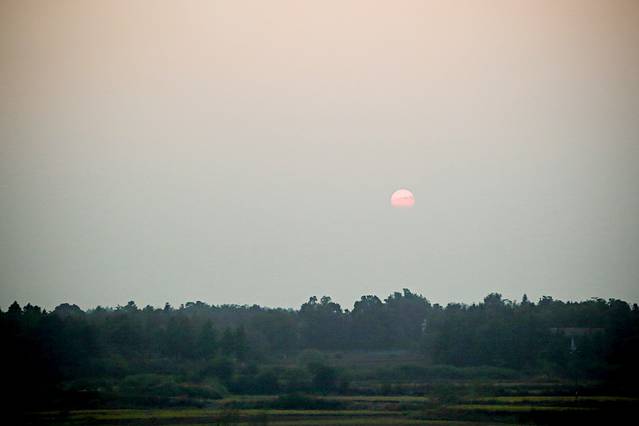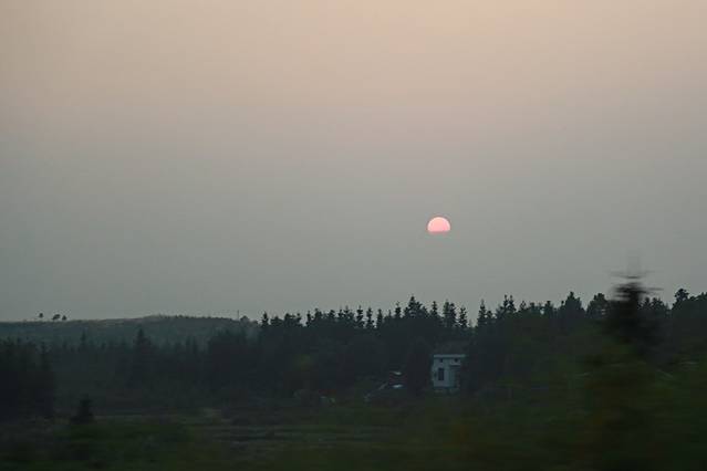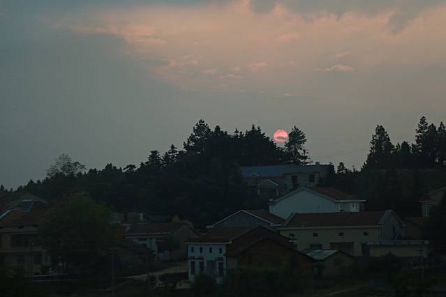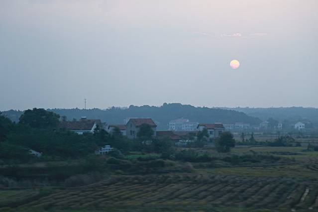 傍晚时分,湖南境内,光线慢慢暗下来,夕阳悬挂天幕,红黄过渡犹如一枚半熟的红鸭蛋黄。寂静的乡村炊烟不见,华灯未起。