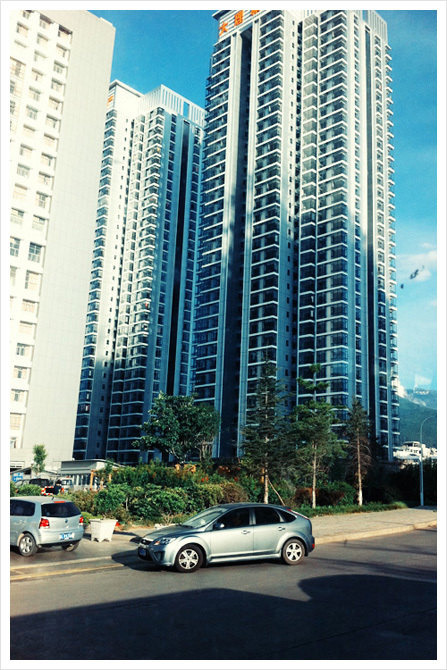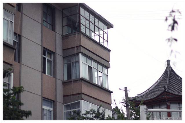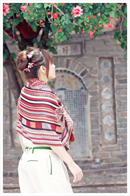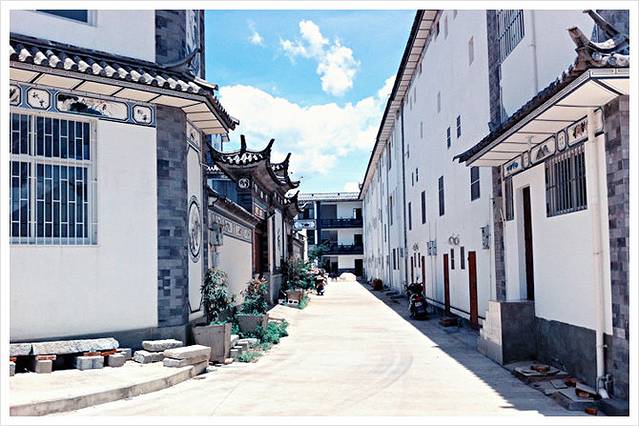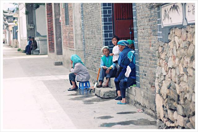 我打量着窗外两边的景致,建筑群落的风格是清一色的灰瓦白墙和山水画,而车辆和行人,除了间或一两个穿着红白相间并裹着头的上了年纪的女人提醒我这是一个少数民族之外,其余还真和汉族无异。