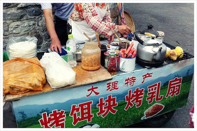 烤饵块就像是夹了一些杂七杂八的馅的煎鸡蛋饼,酱油味道重,也没觉得有多特色。实在没弄明白,为什么除了洱海,还有饵丝饵块,这么莫名其妙的名字。