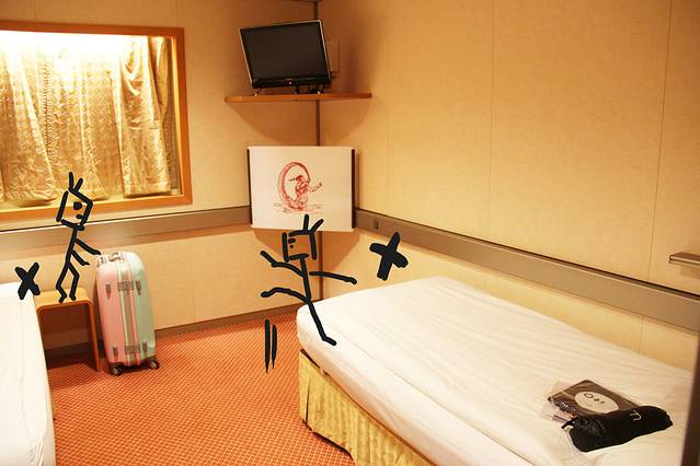 房间内有电视,上图是内舱双人房图片,窗户只有窗帘,没有可以看到外面的景象,海景房可以