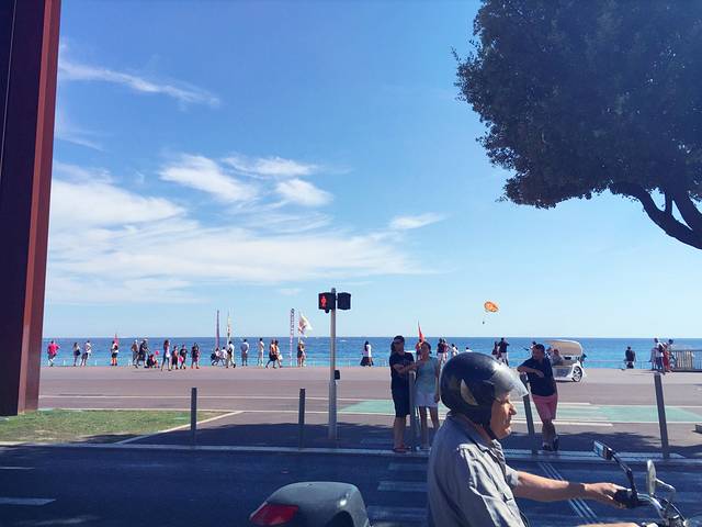 蔚蓝海岸,就在不远的地方。这里已经看得见海鸥留下的痕迹,听得到海浪拍岸的声音。走过一条通道,视野突然变得豁然开朗,著名的步行街英国滨海大道(Promenade des Anglais)出现眼前。这条呈曲线沿蔚蓝海岸一直延伸到机场的大道聚集着豪华饭店和高档餐厅,建筑风格清新脱俗,干净利落,绿化环境也不错。当然,来这里的人们不只是散散步,买买东西而已,最主要的目的还是来看海的。