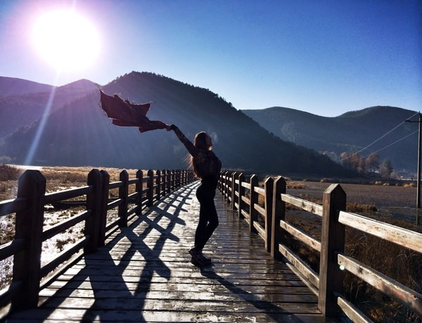 草海中最著名的走婚桥,它是草海芦苇丛中延伸出来的一座长达300米的木桥。据说是湖对岸阿哥去阿妹家走婚的必经之路,成就了一对对情侣。逆着阳光秀一下我的翘臀,咳咳。