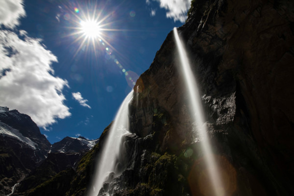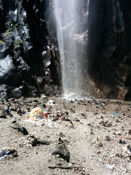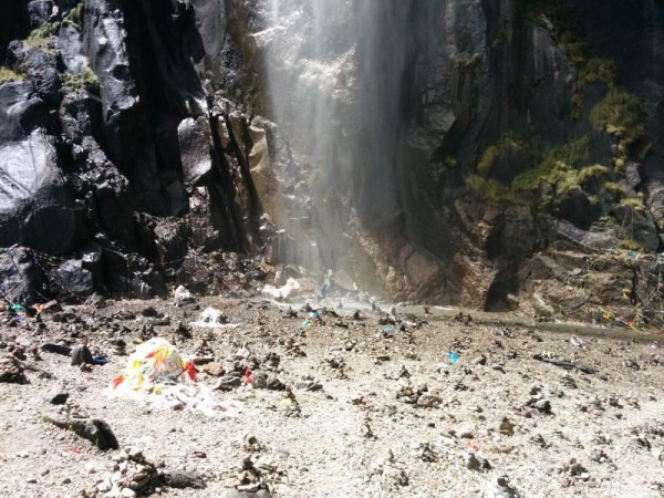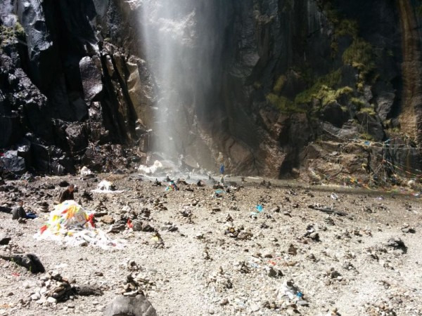 我们整个队伍的几个人都比较随和,都是说出来玩觉得太赶了没意思,而且特别累也玩儿不好,就取消了去冰湖的行程,决定只去神瀑。藏传佛教信徒以到雨崩神瀑沐浴作为一种洁净心灵的修炼,据说神瀑是卡瓦格博尊神从上天取回的圣水,能占卜人的命运,消灾免难,赐恩众生。藏传佛教信徒朝拜梅里雪山,必定沐浴雨崩神瀑。从客栈到神瀑也有7公里的山路要爬,来回要14公里,一天的时间可以边走边欣赏。我们大概是中午12点多到达的神瀑,由于天气山上天气比较冷,神瀑的水更是冰川融水,很多人都不敢去接受神瀑的沐浴。但是,如果你来了雨崩,没有接受神瀑的沐浴,一定会遗憾的。神瀑下的水面中有道道美丽的彩虹,只有走进去的人才能看见,虽然冰水刺骨,但你会觉得这是你一生中最美丽的时刻,彩虹都在你脚下。而且基本不用担心会生病,因为我亲身验证了,哈哈,只觉得神清气爽,浑身从里到外都湿透了。