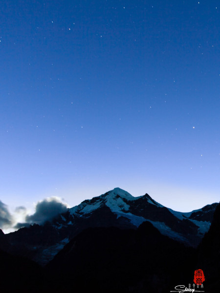 早起运气不太好,冻得要死,但是云彩太多,没有拍到漂亮的日照金山。乘车到了雨崩,开始爬山。高原爬山真不是盖得,一边克服高反,一边克服劳累。如果觉得自己不行,果断骑骡子上山,自己走下山到雨崩,骑骡子上山好像是235一个人,背包另外收费,都是明码标价不议价的。基本上要6个小时到上雨崩,劳累了一天,晚上陪老公拍了一晚上星星,星星是bulingbuling的,而且这边没有光污染,晚上就是一片漆黑,配上骡子,马,牛脖子上的铃铛响,简直就是仙境。爬山的时候觉得雨崩是地狱,到了雨崩村才发现原来雨崩就是天堂。