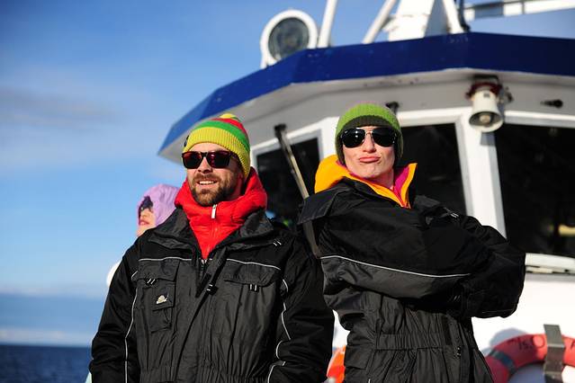 换好衣服,就站在甲板上拍照,这俩是北挪威旅游局的和lofoten旅游局的小伙伴