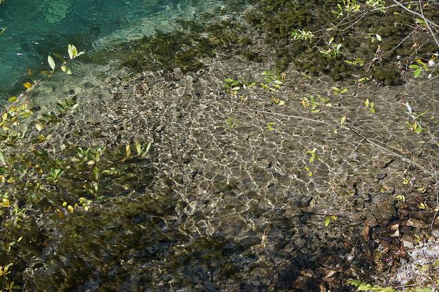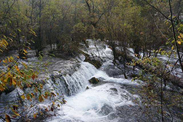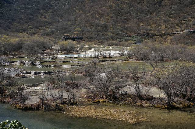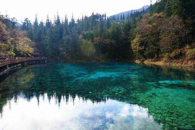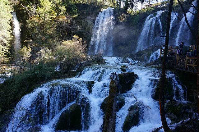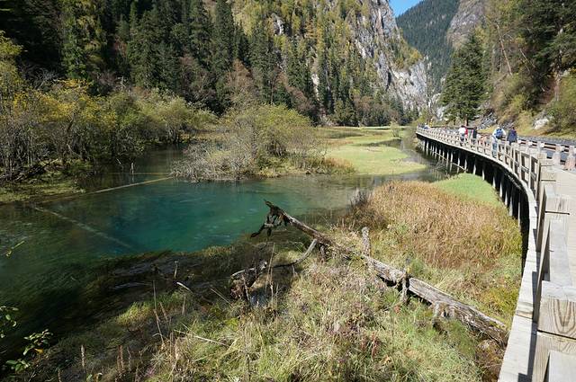 工作人员引导我们下车后沿着树正群海一直走,途径树正瀑布,到老虎海上车。 树正群海有一座小桥,可以过到对面的栈道,这边人流相对少一点,不过树木会比较茂密,视线没有主道上那么开阔。