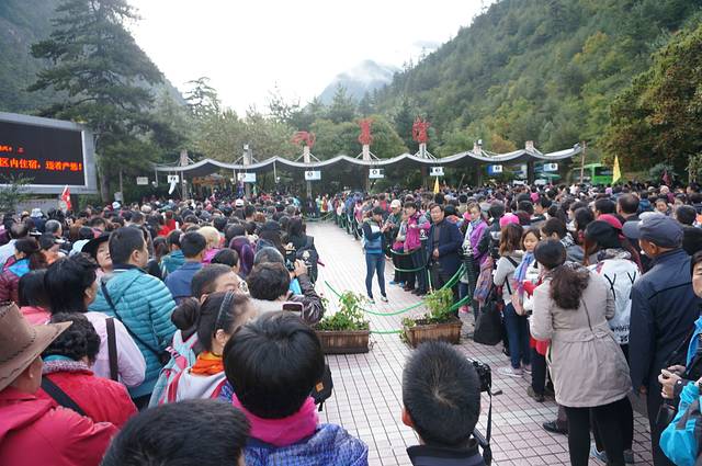 我们7点钟到达九寨沟门口的时候已经是这般人山人海了。不知道是不是吹了暖气的缘故,总是觉得胸口有点闷闷的,再加上人挤人排了快一个小时的队,我的精力值只剩一半了。