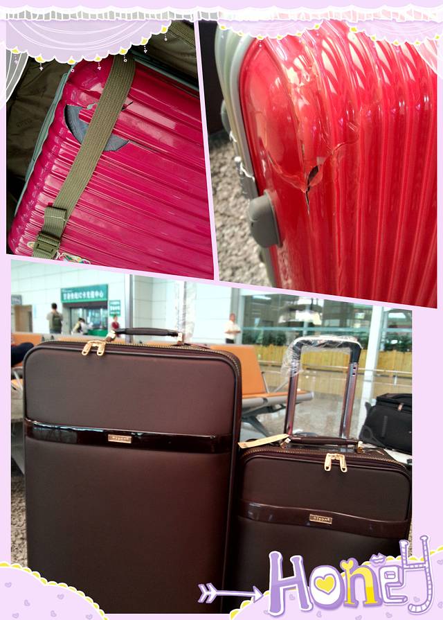 当我们拿到行李的时候真的真的傻眼了。 搭了那么多飞机从来没有试过这样的,怎么可以,呜呜…… 我们去找了白云机场的地面服务,他们啥也没说,看了看我们的箱子,出示身份证、登机牌、行李牌,签字签字再签字。结果给我们换了这么两个,虽然有点伤心,但已无言应对,提着四个箱子回家去洛!