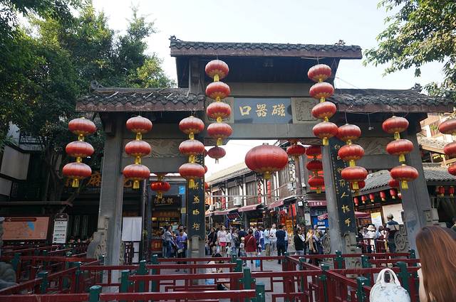 下机后,我们搭乘轻轨(即地铁)到两路口站,这个站是重庆两条轻轨的转换站,人流量非常大。出了地铁,我立刻就感受到了重庆至所以谓之“山城”的“魅力”,大大小小的全是坡,还有数不清的楼梯,拖着行李箱的我们略感吃力,事实上我是绝对很吃力。幸好,轻轨站离住宿的地方不算太远放下行李,我们就搭轻轨去了各大旅游网站强烈推荐的磁器口古镇。
