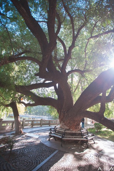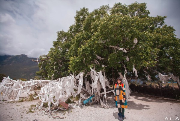 吃完饭坐着景区的观光车,一路往里走。第一站就是一颗大榕树,导游一边讲解,爱拉一路都在摆弄自己的三脚架,一句没听见最悲催的是,爱拉的自拍研究了半天还没成功,随后只好揪住一个路人甲给我咔嚓一张了。
