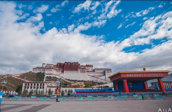 接着往前,安检进入布达拉宫广场。正好赶上庆祝西藏自治区50周年的台子还没有拆除。