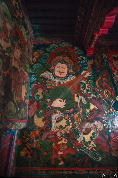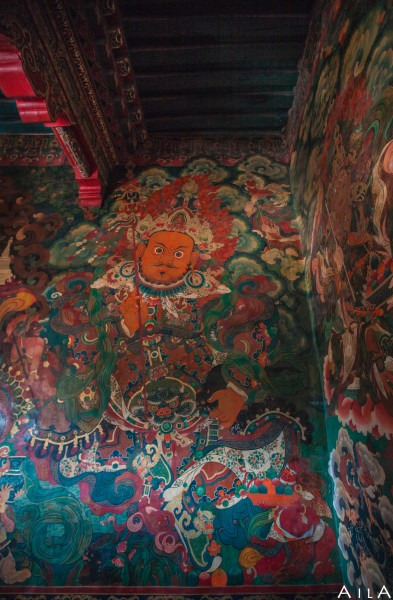 在布达拉宫售票处大门处的左右两幅壁画,上面这幅壁画右下角有一只可爱的老鼠,据说老鼠是有钱的象征,过去的西藏是农奴制社会,下等的努力自己都吃不饱,家里都木有余粮,更不会有老鼠喽~