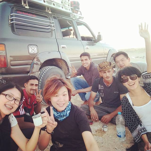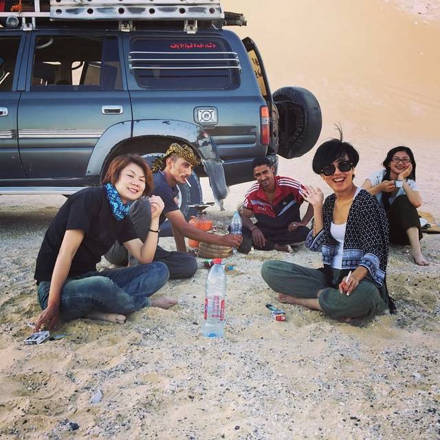中途我们遇见了在开罗大巴站认识的两个台湾妹子,她们正在一个大沙坡上玩儿滑沙,老远的看见我们就互相认出了彼此,我问alaa我可以爬上去找她们滑沙么,alaa说当然ok辣~~~于是我们两辆车在沙漠里开了个小趴,煮茶喝,那辆车的小向导巨搞笑,就是图片中带黄色头巾的那个哥们儿,哈哈简直贫死了,我俩各种挤兑,他挤兑我我挤兑他,还要教我们跳舞~一下午嗨到不行~