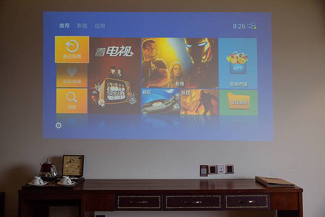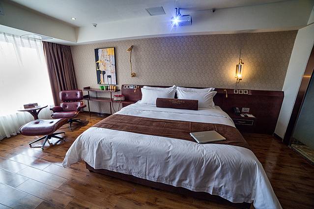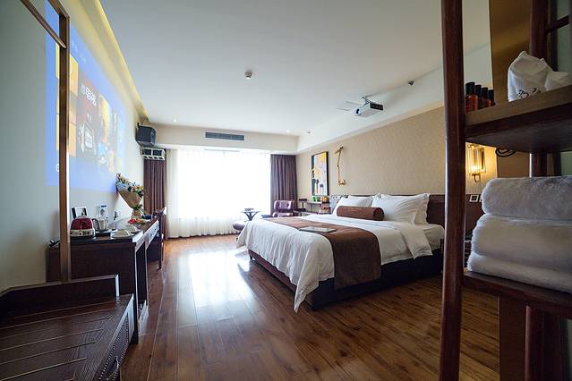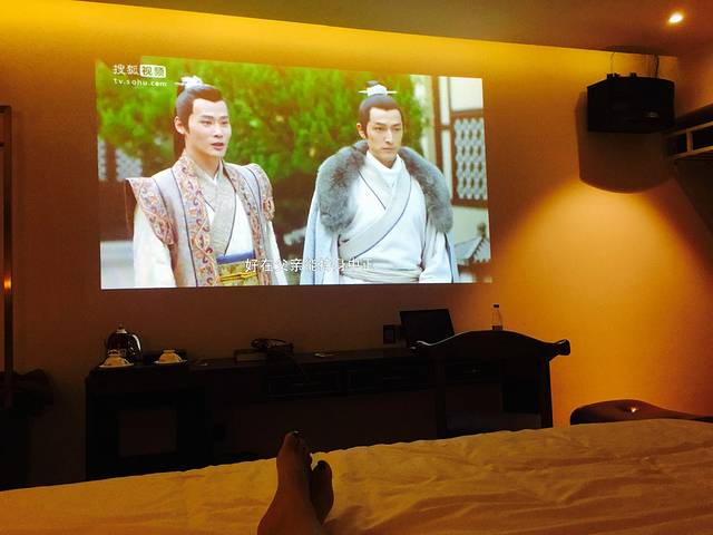 打开房门,哇哦,这是五星级酒店的配置吧。咖啡色的调调,怎么看都那么有情调。超大号的公主床,复古的躺椅,一面墙的投影,环绕立体声,精致的咖啡器皿,一看就是花过不少心思的毛巾架。在旅途里遇见这样的空间,真是让旅途倍感愉悦。