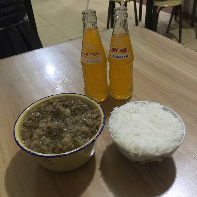 从贾三家出来走不多远就会看到并排两家泡馍店,老米家泡馍和老米家大雨泡馍,不愧是回民街最好吃的泡馍店,里里外外坐满了吃馍的食客,我和大萌萌点了一份牛肉泡馍,坐在小板凳上就开始掰馍馍,来西安是一定要体验掰馍馍的,很好玩,因为馍馍较硬所以掰起来还是个体力活,听店里的人说馍馍要尽量掰的小一些,这样汤水才会更好的浸到馍里,更入味。等馍馍掰好了和服务员说一声换个牌子馍馍就送到后厨淋上肉汤,一碗牛肉泡馍就做得了。老米家的泡馍油很大,碗口浮着很厚的一层牛油,腻的很,但不得不提他家的肉真的是一绝,炖的很烂,入口即化,而且真的是我吃过的最香的牛肉了,导致后几天吃泡馍的时候大萌萌还对他家的肉念念不忘,来回民街一定要来感受下!西安人吃泡馍会就着糖蒜吃,配起来吃的确爽口些。但是比糖蒜更解腻的是冰峰!一种碳酸饮料,其实就是西安当地的芬达,但是喝起来会很接地气,尤其是玻璃瓶上插一根吸管,感觉是很传统的吃法。