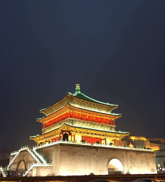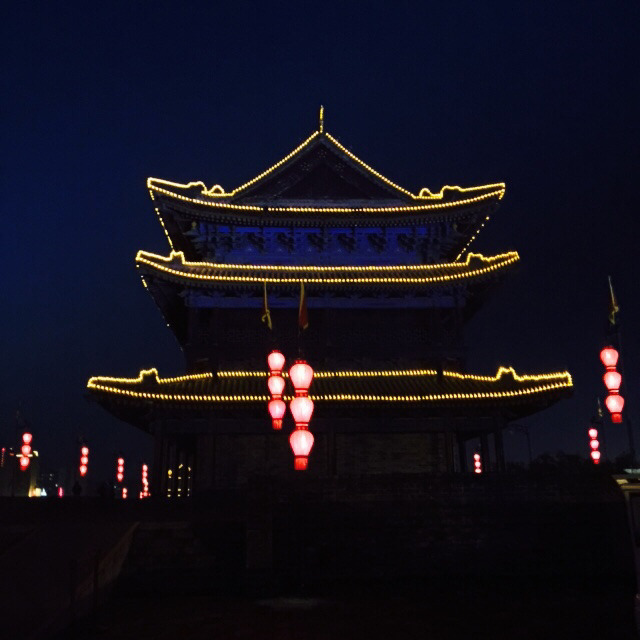 因为去大雁塔的路上正巧路过,回来的时间也正好是酒吧生意正火的时候,就决定进去看看。长这么大还是第一次进酒吧,说是酒吧,感觉就是一个酒卖的很贵、有驻唱的、晚上人很多的、大家一起嗑瓜子说话得扯着嗓子喊也听不清在说什么的地方。我要了一杯莫吉托,听驻唱小哥唱最近很火的南山南,大萌萌歪在椅子上喝她的天使之恋,我俩谁都不说话,到了12点就不约而同的想往回走了。回去的路上可以看到钟楼,很美。