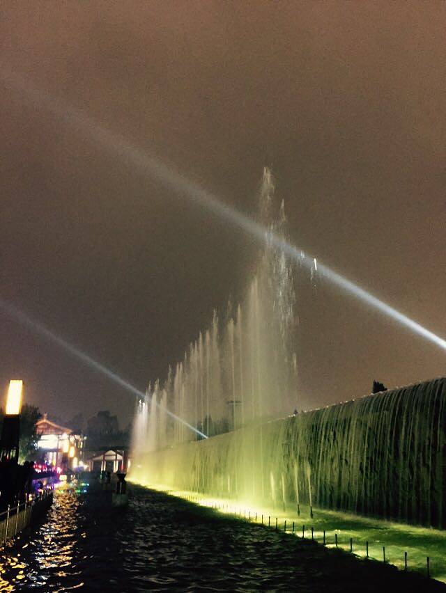 时间还早,我和大萌萌从回坊出来吃的实在是太多了就想溜达溜达,我俩就合计去看看亚洲最大的音乐喷泉—大雁塔音乐喷泉。喷泉每天晚上8:30开始,9:00结束,我俩7:00从回坊出发,暴走一个半小时一分不差的赶上了大雁塔的音乐喷泉。中途还吃了一个西安最好吃的魏家凉皮。和我们吃的凉皮不同,老陕经典的凉皮是不放芝麻酱和醋的,辣子倒是下的很足,辣的我和大萌萌是一吸溜一吸溜的。言归正传说喷泉,虽然我俩都没看过东港的音乐喷泉,但感觉大雁塔的喷泉实在是太温婉了,没有什么震撼的感觉,看过东港喷泉的朋友可以不用考虑大雁塔的喷泉了。但从回坊步行的一路倒是很出彩,会经过城墙,还会经过很长的一条商业街,酒吧一条街,还有陕西省图书馆,8:20的时候我俩还差一站地的距离,就只好蹬着高跟鞋在街道上狂奔,夜跑新玩法也是挺有意思的。我俩都是挺喜欢在城市里溜达的人,所以走那么久也不觉得辛苦,大家倒不用和我俩一样,坐公交就好,很多车都到的。