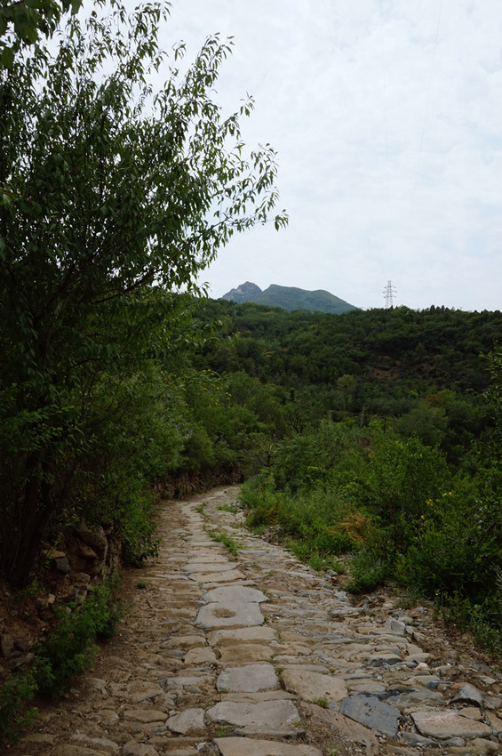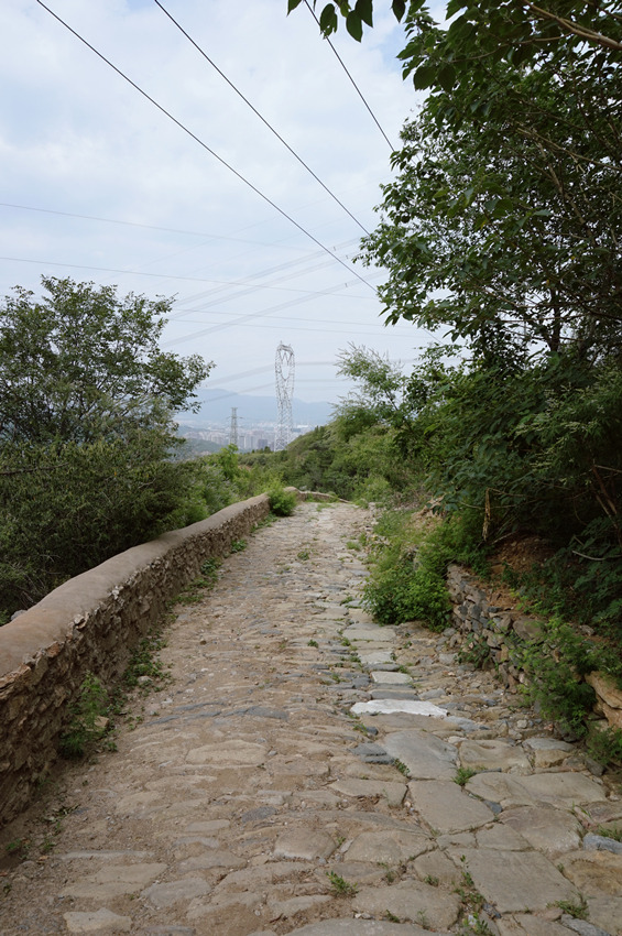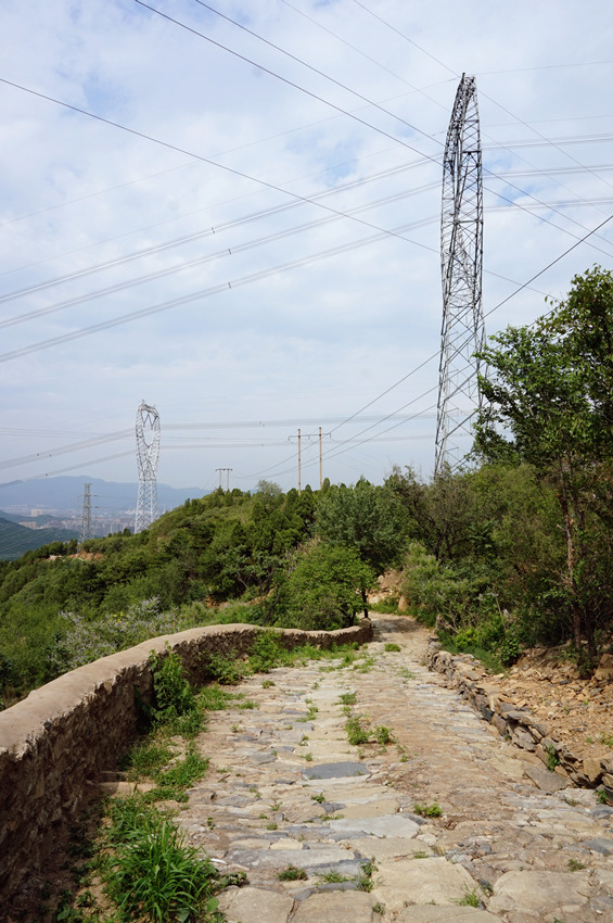 即便是烈日当头,我们享受行走古道的乐趣也丝毫未减。放眼望去,山下隐约处高耸屹立的现代化住宅楼,远处错综交杂的高压电线与庞然突兀的高压线塔竟也成了这古道之上不可缺少的一道风景。