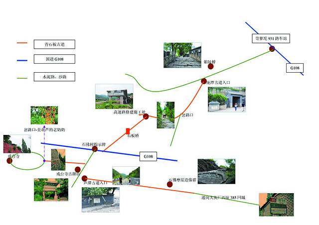 行程路线:石佛村 - 摩崖石佛造像 - 芦潭古道 - 石牌坊 - 戒台寺 - 庞潭古道 - 娼妓桥 - 岢坨村