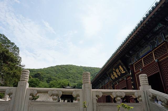 在层峦叠翠的群山环绕之间,显得格外的清净庄严。以澄澈的蓝天为鉴,照应香客的清净礼佛之心。默默低语的佛音禅语与远处的钟声交织在一起,于大殿之中久久萦绕。