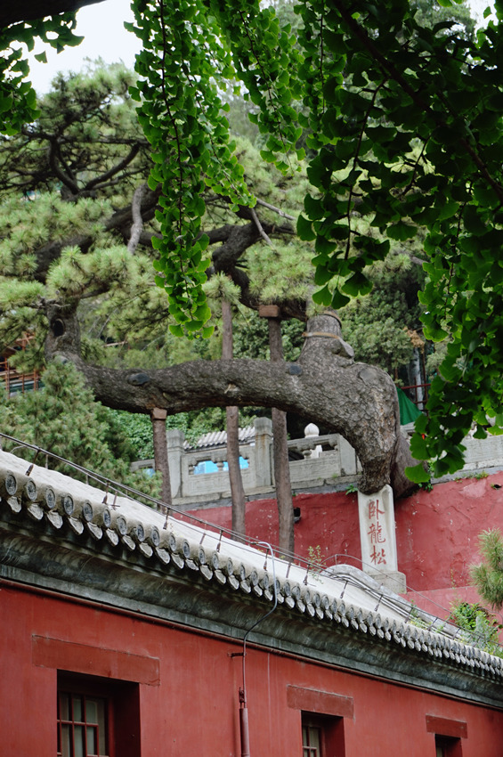 伸展出墙外的卧龙松主干下托有一块石碑。上面的“卧龙松”三个字是清末恭亲王奕䜣亲笔所提。据说这足智多谋的“鬼子六”迟暮势颓,自光绪十年便迁居戒台寺“养疾避难”,长达十年之久。观其字字苍劲的笔法,独爱“卧龙”的奕䜣似乎还是心有不甘的。