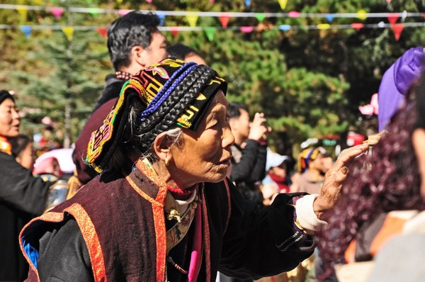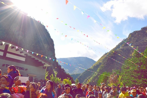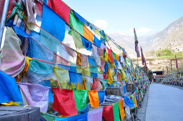 一直好奇飘在空中的这个是什么东西,它叫“龙达”,意即风马,是吉祥的图案即只是增加运气的风俗,藏族祈福用的,结婚的时候过节的时候会用到,这图案有游客说像二维码,呵呵,远处看是有点像。我们走进寨子的时候当地人就会送哈达、撒龙达、请喝酒,就这样被夹道欢迎着走进寨子。好害羞,哈哈!快步移动中……