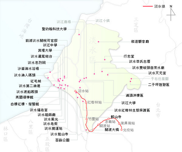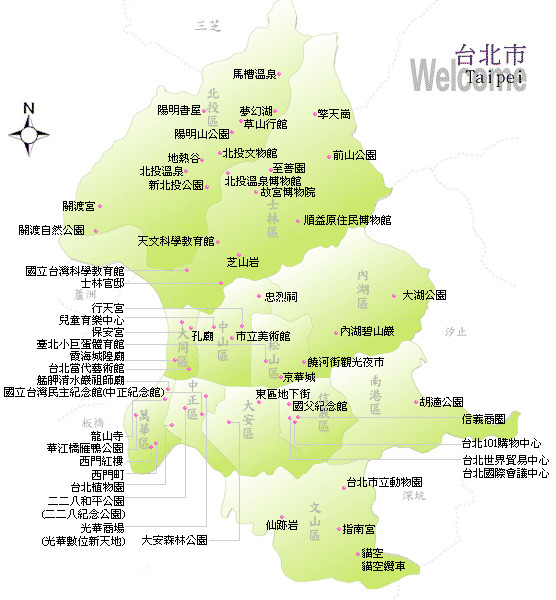 台北——总统府;中正纪念堂;西门町;西门红楼;诚品书店;台北故宫;101;宁夏夜市;饶河街夜市;艋舺夜市、华西街夜市;台北车站;各种商场。