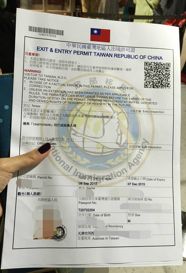 入台证是一张A4纸彩色打印的,上面有申请人资料,以及二维码。