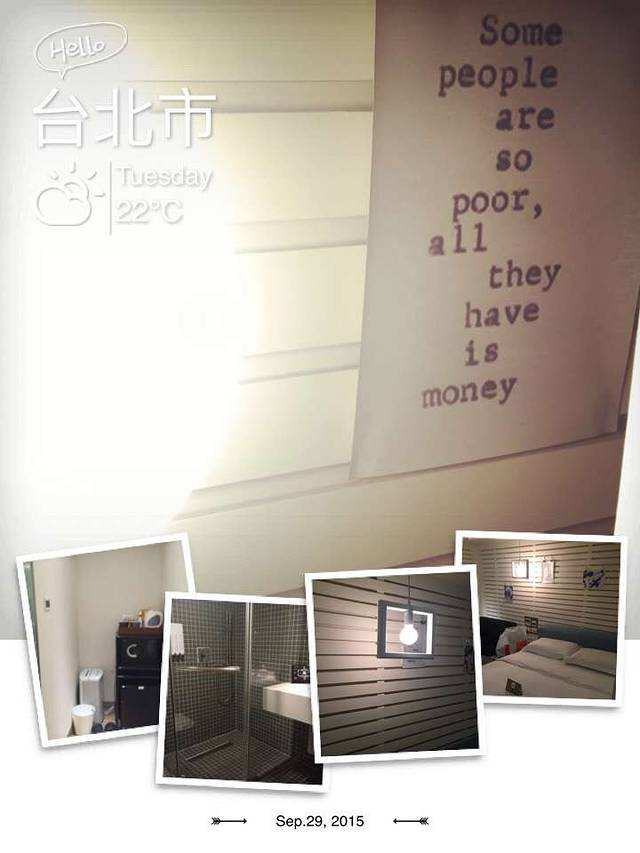 评——一般,不推荐。位置好,西门町商圈内,繁华,不吵;无窗;无前台;有电梯;有异味,不知道是不是因为赶上下雨,卫生间非常味儿;有公共洗衣设备,但是不好用;用品不齐全,只有牙膏牙刷洗发水沐浴液,肥皂梳子一次性剃须刀都没有,而且住三天只管倒垃圾,不收拾房间,不更换用品,牙膏牙刷在沟通下更换了,单依然很影响居住感受。