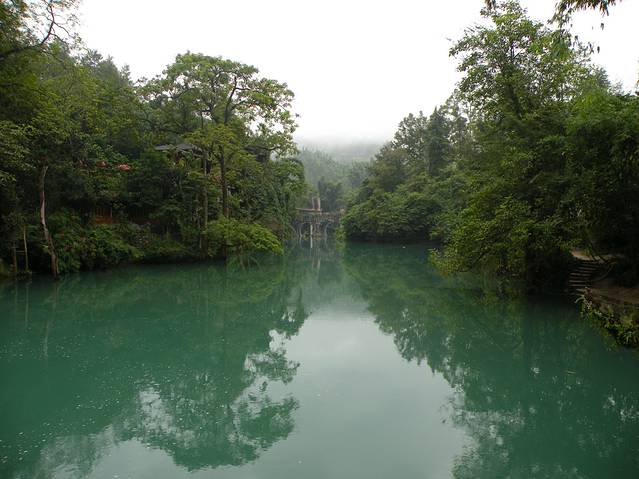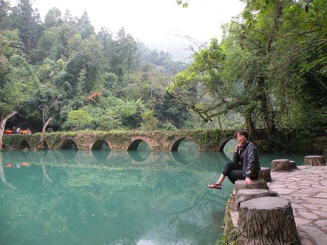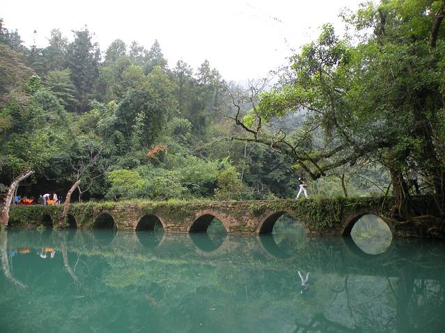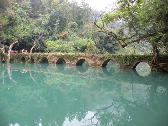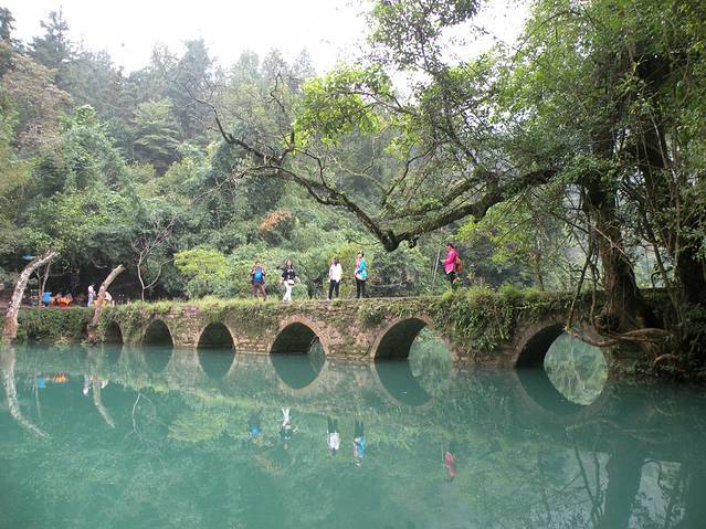 (第四天)10月8日起了个大早,早上7:30分进入小七孔景区,因为听说小七孔景区有约30公里的游览路线,所以买了30元/人的游览车票。坐上观光车到达景点第一站“小七孔桥”。可能是天色尚早,游人稀少的缘故,远看古老“小七孔桥”静静的坐落于荔波樟江的响水河上,卧于深潭碧水之中。桥上随着岁月的流逝,此时的桥身两侧和桥面被苔藓植物及灌木所覆盖,寂静而安详。潭边青翠的树木苍翠欲滴,有水流缓慢地从七个孔洞静静流淌,舒缓而又清寂,我立刻喜欢上了这片安静,静静的响水河把小七孔桥倒影在水中,与旁边的景致演变成了水天一色的美景,此时此景显得十分静谧与清幽。