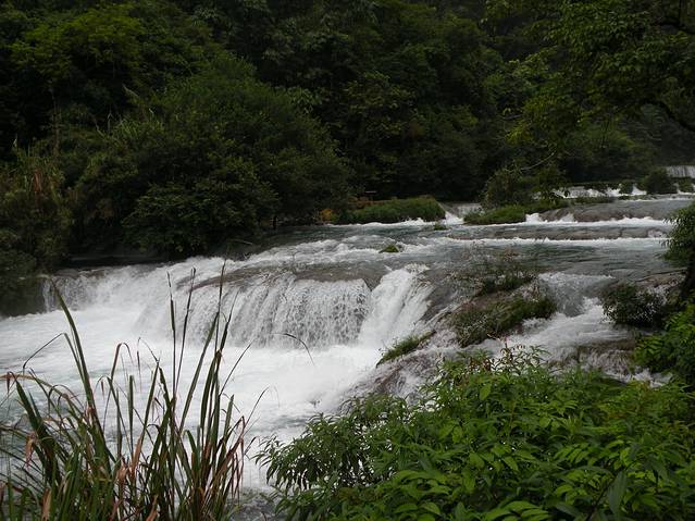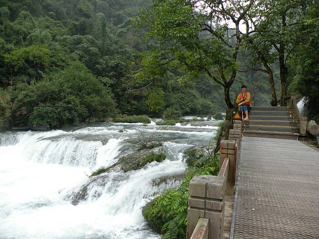 顺着樟江河往上走,映入眼帘的河道越来越宽阔,水流的声音也越来越响,过了拉雅瀑布,转过一个大弯道,眼前出现了如阶梯式的水瀑,六十八级叠水瀑布到了,银白色的浪花倾泻下来,高歌着、跳跃着、欢快地追逐着,齐齐从上面的阶梯上一台一台涌下来,高兴得不得了,各自有着不同的姿式,有的逗趣式的露出小脸,有的像飞人乔丹,高举着球跳出水位线,有的又像是马戏团的底坐演员,尽力挺举着同伴……真是千姿百态,那么欢快和愉悦!那气势、那声响有种荡气回肠之感,隆隆之声不绝于耳,远远看上去台阶式的瀑布,闪耀着晶莹的银光,一次又一次的冲击着河床,一阵又一阵的迎击着水流,撒欢式的往下跑。由于下雨河水上涨,不能下到河床上玩水,只能在岸上观望,仍能见到水瀑中间有些绿色植物在顽强的伫立,迎风飞舞。