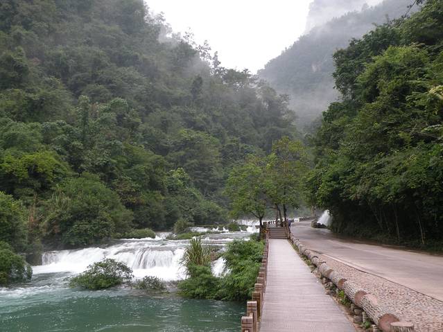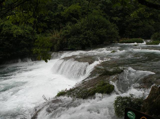 再往上游继续走,到了响水瀑布,由于瀑布的落差大,再加上多条水流汇集于此,河水水道由宽变窄小,水流的声响简直哄然而鸣,甚是高吭。水流湍急,激起很高的浪花。