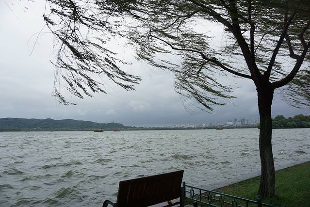 这里距离西湖十景之一的“柳浪闻莺”超级超级近,我按捺不住兴奋的心情,立刻到西湖边上走了几步.风特别大,水面漾着波浪,柳树枝条被吹得横起,上张图给大家感受下: