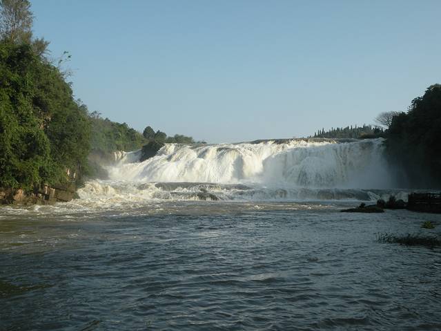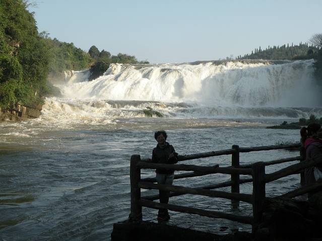 还真是的,由于选择的路线恰到好处,所以我们有幸从黄果树大瀑布的上游到中段,然后再到下游全方位的欣赏大瀑布的景观。上游瀑布水流宽阔,由于多条水流汇合,层层叠叠倾泻而下,下到中段却是云雾缭绕,水珠飞溅。淋湿了衣物和鞋子,相机也被打湿,不能拍照。由于前两三天的时间里,这里都是阴天下雨,所以我们现在看到的瀑布水流湍急,水流量很大,昨天当我们到达黄果树景区时还曾看到黄果树大瀑布的水帘洞还是关闭的,今天能开放也算是我们有福气了,尽管没拍到几张照片,但却真实而又难忘的体验了瀑布雾气和瀑水的冲刷而留下了难忘的回忆。