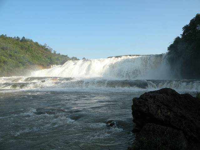 顺着导览路径我们从瀑布中间穿过后来到了瀑布下游,这儿能更加完整清晰的仰望大瀑布的全景,真是“飞流直下三千尺,疑似银河落九天”!宽大的瀑布像天上的银河,落入深潭,飞溅起层层浪花,由于瀑布下面的犀牛潭深不可测,伴随着跌落的水雾,像轻烟一样凫凫升起,好看极了,这时光线很给力,太阳出来了,与水雾在瀑布周围形成了一道弯弯的七色彩虹,美丽极了。这幅画以彩虹为界,上面是青翠的山坡,一条白色的蛇形小道;彩虹桥以下是白色水雾,而中间是七彩虹桥。感觉就像人间仙境,有情人越过重重阻碍,来到人间相会,就可以凭借美丽的彩虹桥,了却情缘,演绎一曲人鬼情未了!