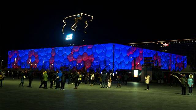 去的时候水立方没有开灯,只接收了鸟巢大屏幕的光,有点反光的效果。
