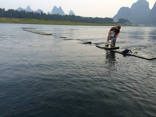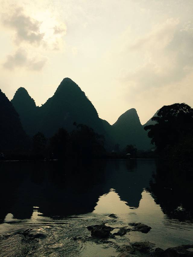 傍晚的漓江,水非常清澈,看到很多人就直接坐在石头上,腿泡在江水里,非常舒服