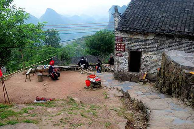 弯弯曲曲的山路,错落有致的山房,在古寨之中,完整地保存着瑶族人古老的生活风貌。有古朴别致的吊脚楼,有凌空高挂纵横交错的竹水笕,有生火烟熏并举的火炉塘,有下作牛栏上作储粮的粮仓,还有原始的酒坊、豆腐坊、榨油坊,一砖一瓦,一门一户,朴素地展现着瑶族人千百年前的生存状态。一不留神,心飞到了千百年前的那个阳光灿烂的午后,看见瑶族人欢笑行走在这土地上,自然淳朴。 在一处古屋的后墙屋檐下,还可依稀辨别汉云纹的装饰画,几个正楷的汉字“百子千孙”,光绪年间所刻,令人猜测当年的主人家可能还是几代同堂的大家庭。寨中还能见到解放后留下来的标语,字迹清晰可见。一千四百年的沧桑历史在这一片的土地之间一一呈现。