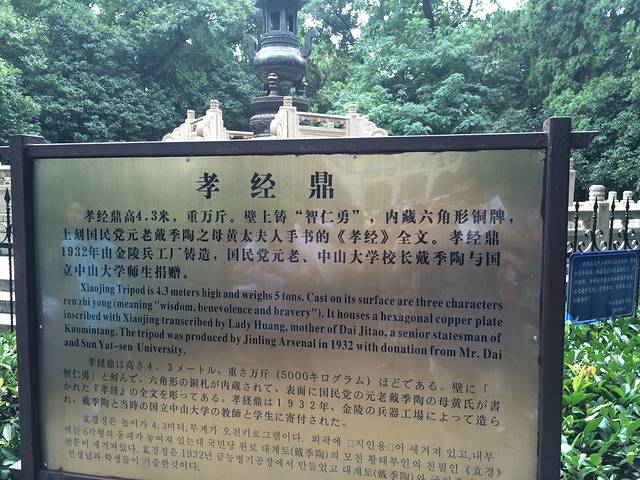 广场正南是一座八角形石台。台上那尊双耳三足的紫铜宝鼎,重5000公斤,高4.25米,腹径1.23米,是中山陵纪念性装饰之一。此鼎铸于1933年秋,由广州中山大学全体师生和戴季陶捐赠。鼎一面铸有“智、仁、勇”三个字,是中山大学校训。鼎内竖有一块六角形铜牌,上刻戴母手书《孝经》全文。