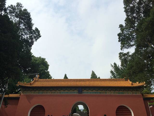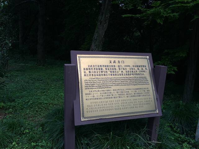 顺坡而上,首先看到的是文武方门,这是陵宫的大门。它黄瓦,朱门,红墙,相互映衬,尽显皇家的气派。这座门是1988年根据史料重修的大门,在门前在墙外的东侧,有一座特别告示碑,立于宣统元年,上面用日德意法英俄六国文字书写,内容是告诫游人要保护孝陵。