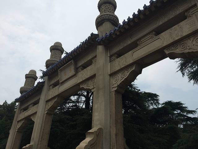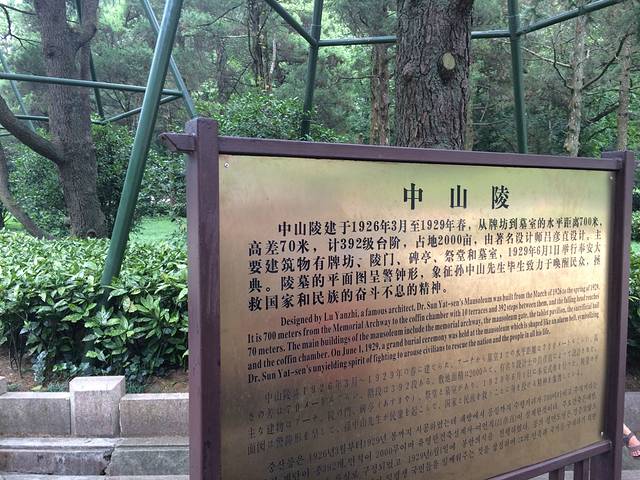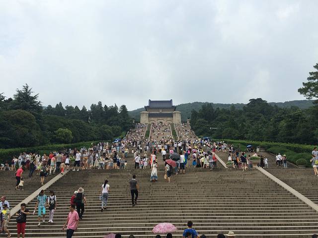 尤其是登上顶台,由此既可鸟瞰,更宜远眺。置身此间,背倚巍巍钟山,耳听阵阵松涛,更觉伟人的浩然正气与大自然同存。祭堂处在钟山半山腰,从博爱坊到祭堂总共有392级台阶,高差约70米,平面距离700米。如从碑亭数起则有290级台阶。建筑师为避单调,将这392级台阶分作10段,每段1个平台,总计有大小10个平台。更妙的是,从下向上看时一望到顶,石阶连绵不断,不见平台;而各位现在朝下看时,却反而不见台阶,只见平台了。这392级的数字并非巧合,而是暗喻了当时全中国三亿九千二百万同胞。一路登行,“高山仰止,景行行止”,对中山先生敬仰之情不禁油然而生。
