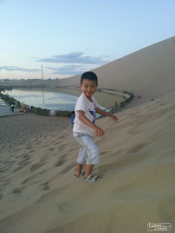 在我和老婆的鼓励下,儿子开始爬鸣沙山。我们都万万没想到,这小子一口气就爬到了山顶,同时也差点要了我的老命。