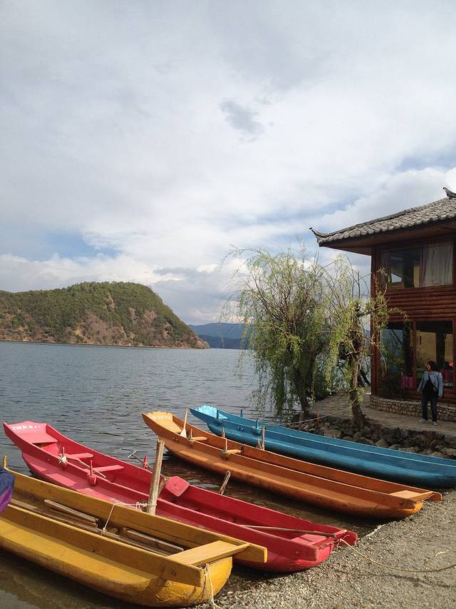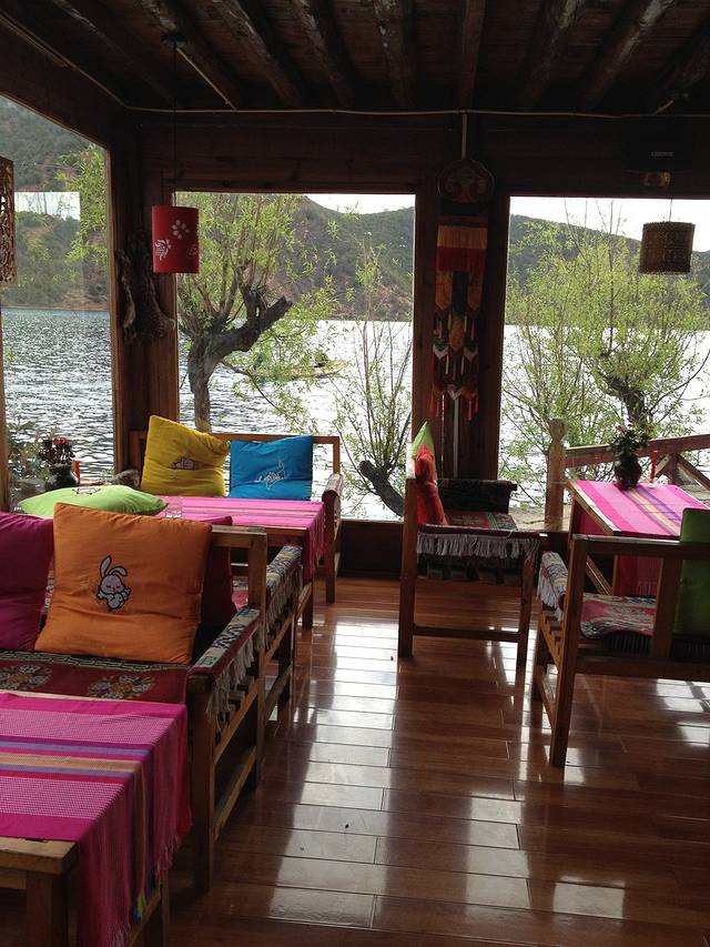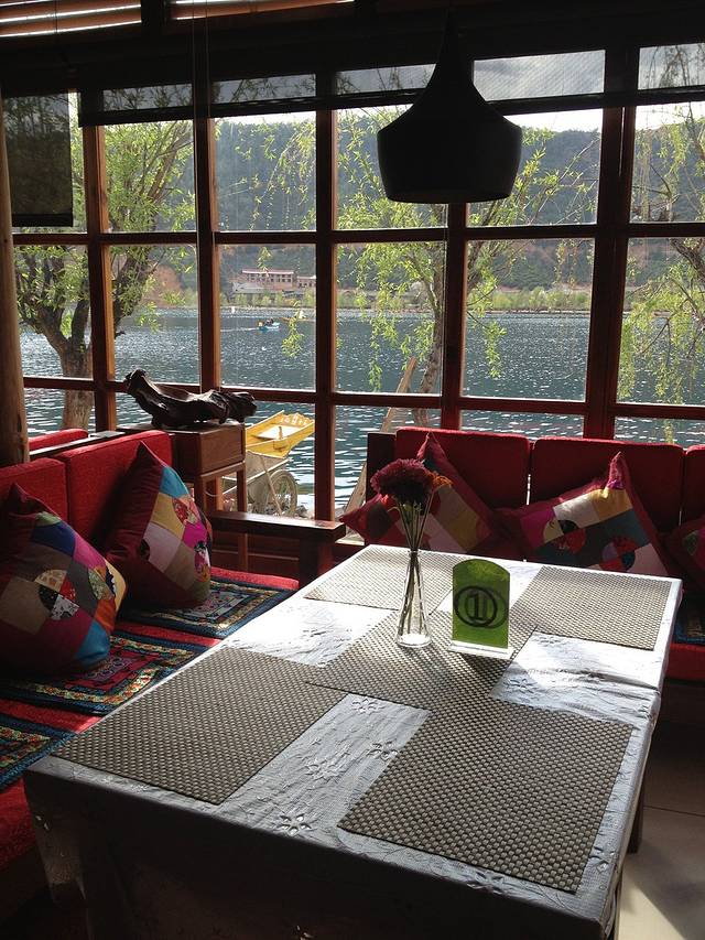 先搞定住宿,大落水的湖思茶屋国际青年旅社是个很不错的选择。大床房性价比超高,2F,只要88元。如果没住过湖景房,湖思是个很不错的选择,2百多,直面湖,房间比里格大,有独立的阳台、茶几,喝茶发呆绝对好。楼下有个书吧,聊天、阅读、发呆,很舒服。相比里格的人来人往,大落水显的冷清,从很多店铺都关张歇业可见一般。消费却更贵,一碗意面近50元。大落水的湖水是浅蓝色的,湖面更开阔,里格更清澈、湛蓝。